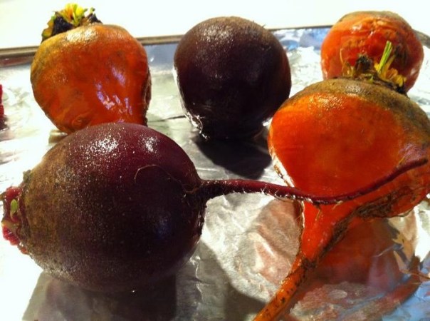 When roasting the beets, leave them in their skins with roots and stem intact. Do not be alarmed if they shrink from their skins and look overdone. When peeled, a beautifully tender and vibrant beet will be revealed. Beets can be roasted the day before and stored in their skins in an airtight container for a day or so. One tip is to wear gloves when peeling & slicing them. Although I never wear them and it hasn’t happened to me, one friend told me a tale of magenta hands that lasted for days. Good thing we’ve been pals since childhood!